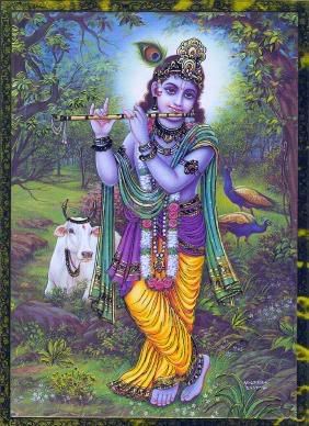 ...In Brahma-samhita the transcendental land of Vrindavana is described as being always spiritual. That spiritual land is populated by goddesses of fortune, who are known as gopis. These are all beloved of Krishna and Krishna is the only lover of all these gopis. The trees of that land are kalpa-vriksha, wish-fulfilling trees, and one can have anything he wants from them. The land is made of touchstone and water of nectar. In that land all speech is song, and all walking is dancing, and one's constant companion is the flute. Everything is self-luminous, just like the sun in this material world. The human form of life is meant for understanding this transcendental land of Vrindavana, and one who is fortunate should cultivate knowledge of Vrindavana and its residents. In that supreme abode are surabhi cows that overflood the land with milk. Since not even a moment there is misused, there is no past, present or future. An expansion of this Vrindavana, which is the supreme abode of Krishna, is also present on this earth, and superior devotees worship it as the supreme abode. [i.e., Gokula Vrindavana, the Vrindavana that is in India, the earthly location of many of Krishna's terrestrial pastimes].