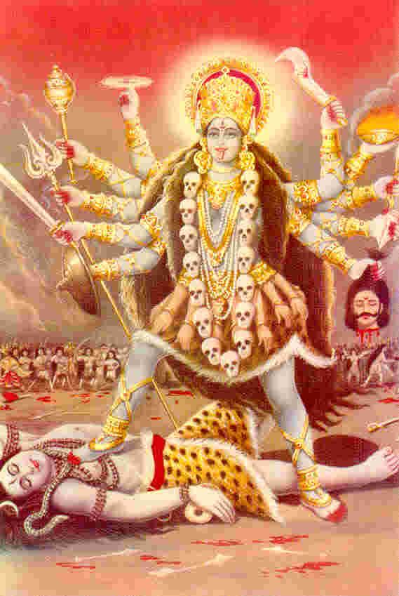 A view of Kali, one of the aspects of Durga, as she kills the demons