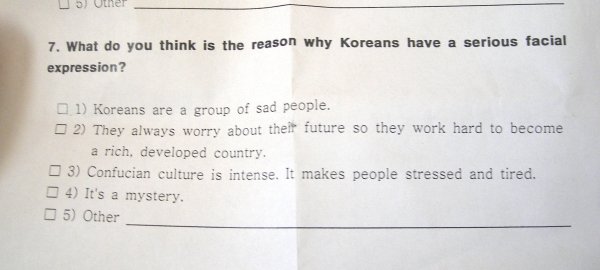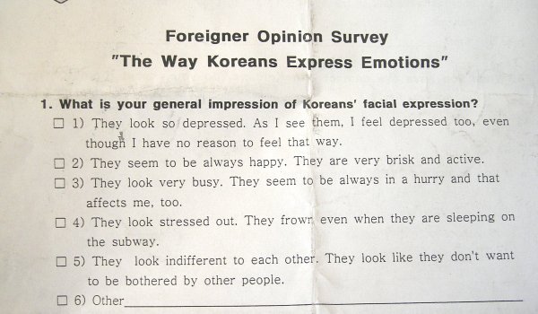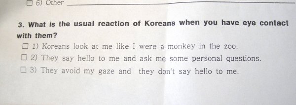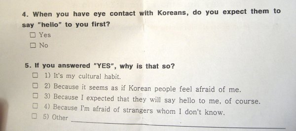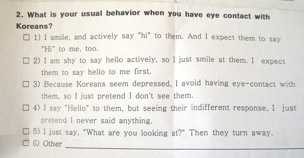 I agree. This survey assumes Koreans all behave in the same exact way. The way I (don't) interact with Koreans on the street is different for everyone. Also assumes I go around smiling and saying hi to every Korean I see or expect the same from them.