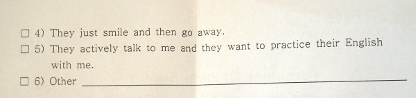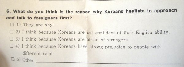 Lots of Korean students get send out to do surveys of foreigners as part of some university class. Usually it's "how much do you like korea? very much? very very much? or more than your own mother?" I don't mind doing them. The kids need to get bodies. I usually play the awe struck tourist vs the grizzled ESL teacher. "Oh I love Korea! Everyone is sooo friendly!"