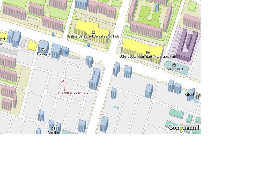 If you're at the front door of Galleria department store, facing the main street, it's across that main street, about 200m directly into that opposite block. You'll have to make some turns and such, but, really, you'll find it if you cross into that block and wind around a bit. |