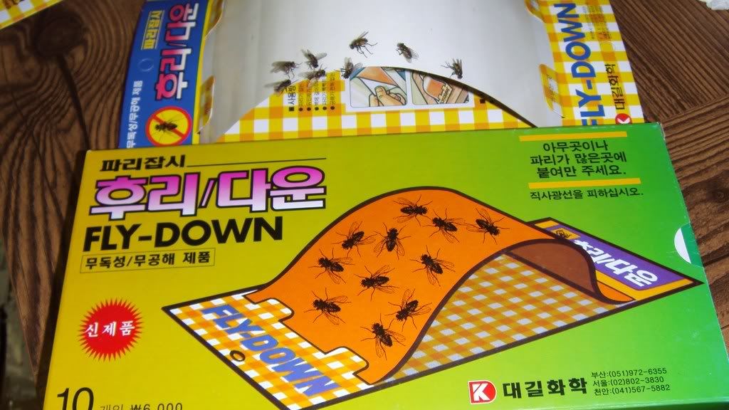 In case there are others out there with a fly problem, I found these sticky sheets at the local corner store. They cost 2200 won for a pack of 10 & they're brilliant. As you can see from the pic, after 30 minutes there were a dozen or so flies out of action.