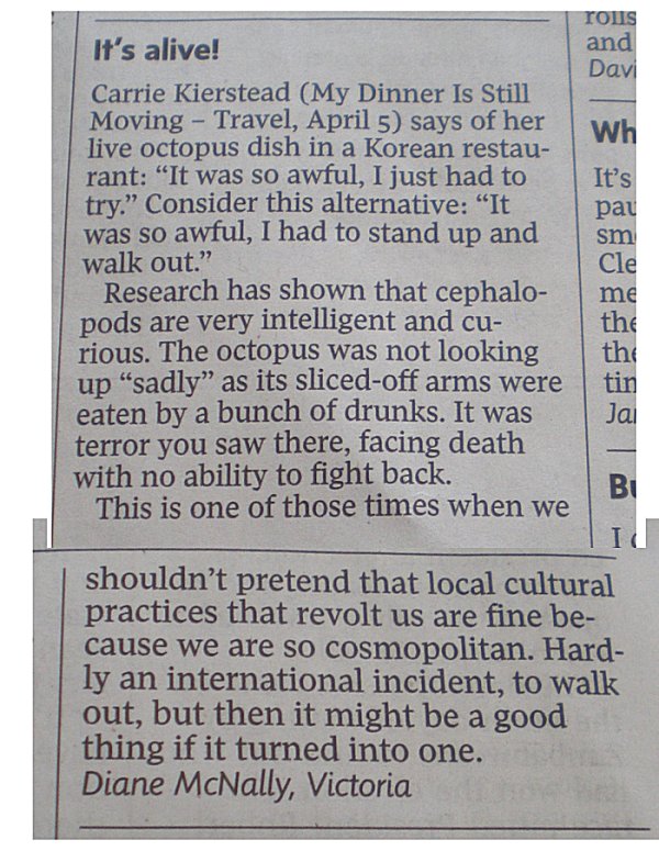 The Globe & Mail has a little reader column where you can write in about your exotic dining experiences on your travels. An english teacher wrote a story about eating live octopus with her Korean coteachers. It was funny enough. She was being cute and succeeded in her attempts. Well, someone wasn't laughing: