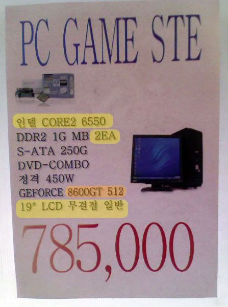 Anyhow I went to Yongsan today and took a picture of a brand new computer price (I wasn't in the cheap building) - this computer is a core 2 duo and includes a 19" monitor as well as the 8800GT vga card with 512 memory.