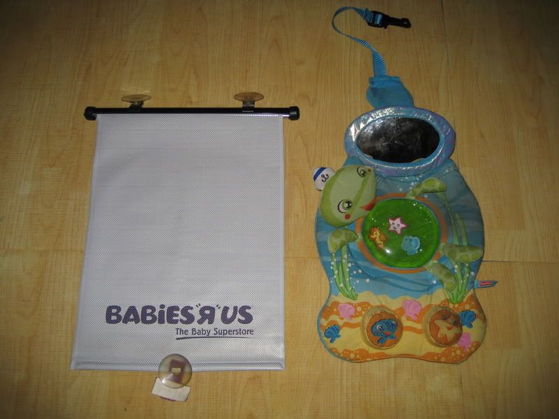 sun shade and fisher-price musical car seat kicking toy with mirror: