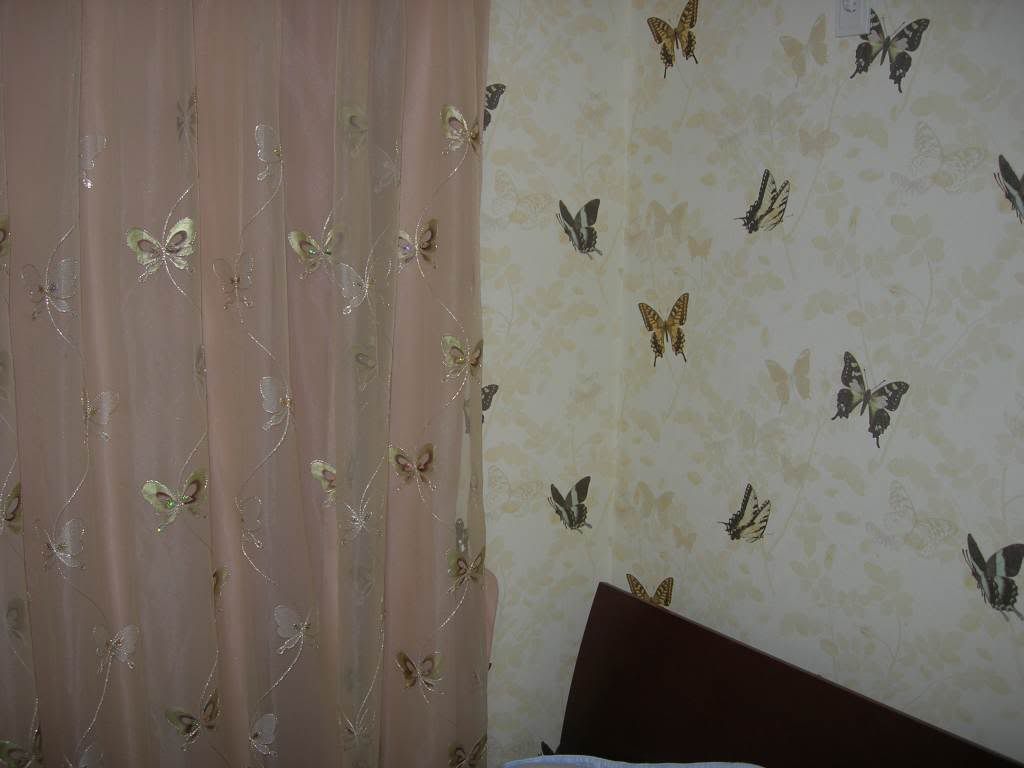 ...wow. The wallpaper job looks terrific but, I have to say, I think it is pretty tacky. What's wrong with plan white walls? Don't you sometimes freak out when you first wake up 'cause you think you're being attacked by enormous butterflies?