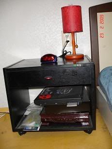 Small black T.V. table on wheels with one drawer and storage underneath. I have used this as a bed side table for a lamp and alarm clock. 10,000Won or best offer