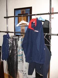 Free standing clothes rack (poles from floor to ceiling and two cross bars) can adjust width and height. 10,000 Won or best offer