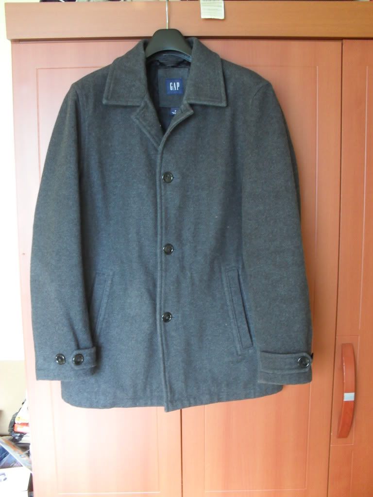 It's from GAP. I got it as a Christmas present last year from my mother who thinks I'm bigger than I actually am. I have kept it in a plastic bag, and just took it out to take a picture. It's dark charcoal gray. Wool blend. Quilted liner.