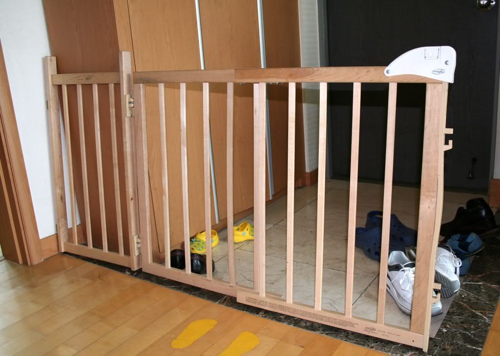 Evenflo child-proof gate, wooden. Good condition. Currently set to approx 1.4m wide. Adjustable (adjustment and installation requires minor handyman skill - see electric drill below). May also be suitable for small dogs. Keep your little one from dangerous parts of the house, and/or protect your expensive or fragile valuables.