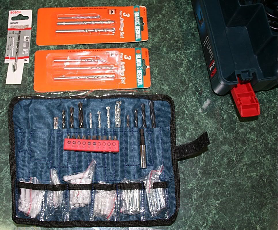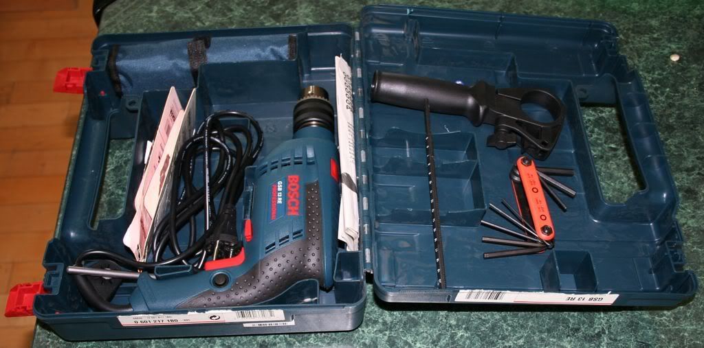 Bosch electric drill set. Hardly used. Includes storage case and a whole load of accessories such as screws and those little expanding plastic fasteners for attaching pictures to plaster walls.