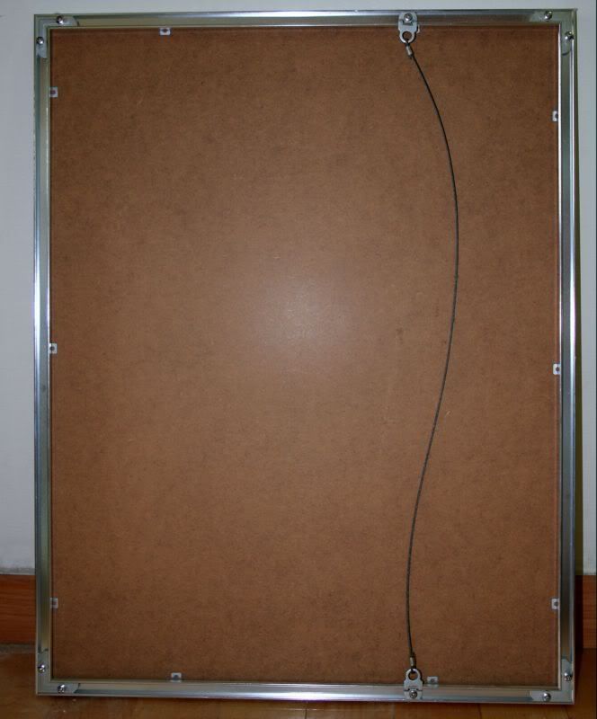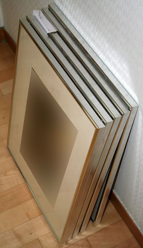 Set of 5x picture frames. Very good condition. 60 x 48 cm, brushed aluminium/chrome with hardboard backing and clear plastic "glass". Professional cable at back, not string. Pictures included, but are easily removable.
