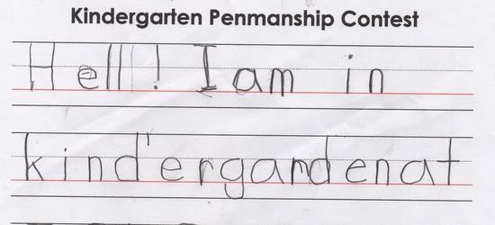 I had an informal little Kindergarten penmanship contest on Monday. They all had the same amount of time to copy the same sentences. One kid had a different take on the whole thing: