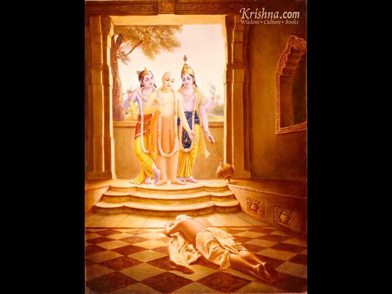 To bestow mercy upon Sarvabhauma Bhatacarya, Sri Chaitanya Mahaprabhu manifested His four-handed Visnu form and then His original form as Krishna.