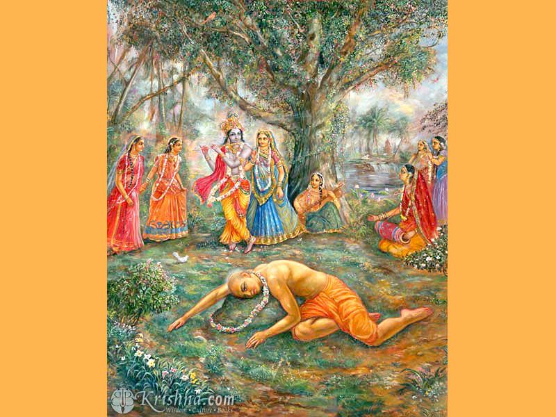 Lord Caitanya in a trance, recalling the pastimes of Krishna, Radharani, and the gopis. |
