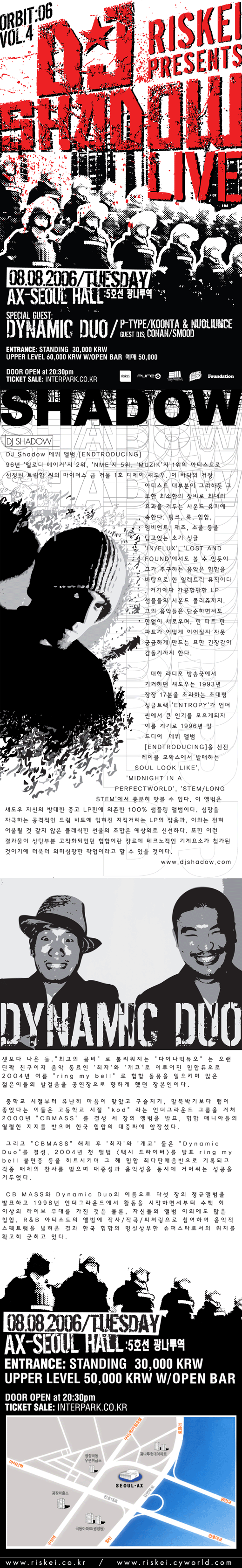 | I saw DJ Shadow last year at Club Air in Tokyo (Daikanyama), it was sick... If I recall, DJs Keb Darge and Dante Carfagna were there as well -- plenty of great mixed funk all night, from probably the best funk DJs in the world today. Shadow is a real talent, if you get the chance to see a show, I'd highly recommend it. |