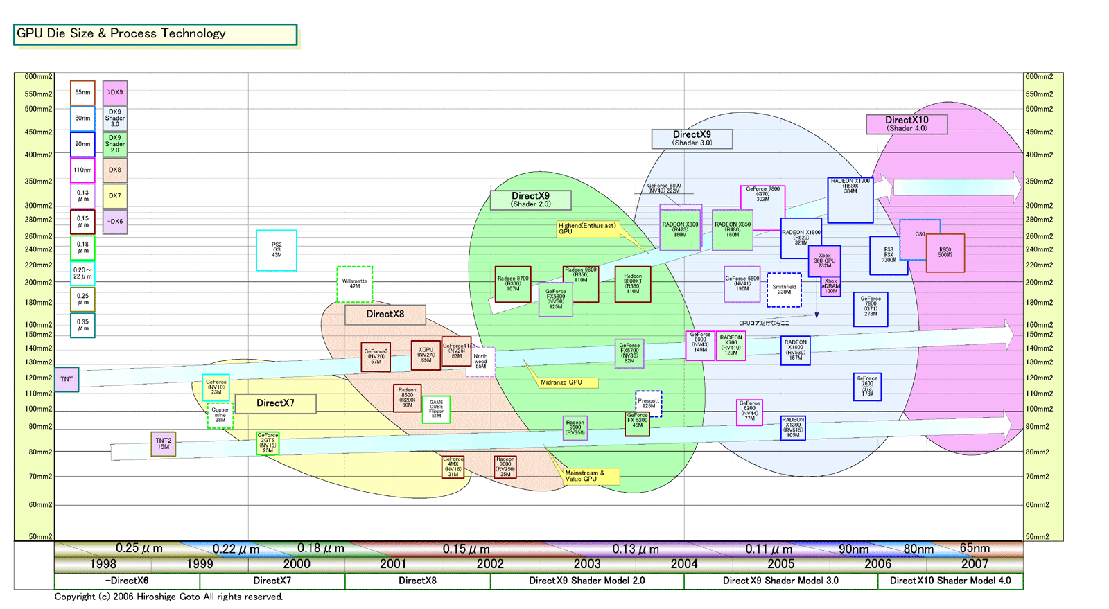 Well, to say that GPUs have become larger because of DX is a bit misleading. GPUs have surpassed CPUs in their complexity and transistor numbers, so the growth is accounted for. DX created guidelines for the chip makers to adhere to, but who knows what they would have done if there were another API set as a standard? My guess is they would have gotten bigger under any API. However, heat is becoming an issue, as is power consumption, so they better do something before long. Smaller dies, new fabbing, faster silicon...something....anything, but the idea of a 500W PSU is just stupid.