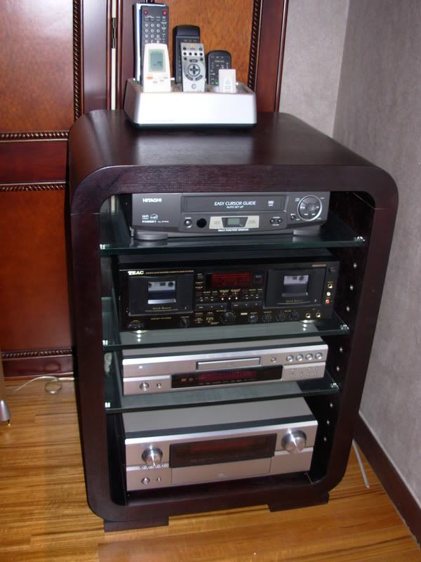 Front row: A/C, projector, screen. Middle row: DVD player, tape deck (yep), VCR (yep). Last row: AV receiver.