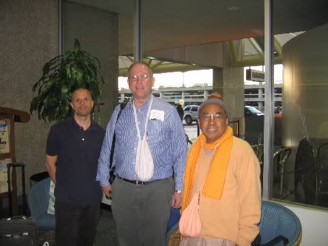 The man in saffron robes is Dr. TD Singh (Bhaktisvarupa Damodar Swami) organic chemist and International Director of the Bhaktivedanta Institute. http://www.hinduismtoday.com/archives/1990/05/1990-05-03.shtml He's hospitalized with relatively minor inuries to his hand...