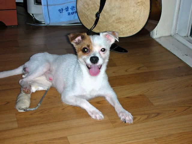 I found Samee on the streets last June, a couple weeks after I arrived. One of his hind legs was shattered, he had an eye infection, skin infection, hip dysplasia, and pieces of rubber and lot of other stuff matted into his hair. After 8 months in a cast, numerous surgeries (and neutering ), and daily vet visits for physiotherapy (although he still needs to build some muscle in that leg he didn't use for about a year) he's a happy and extremely loyal dog. Housetrained from the minute I brought him in, I find he's very sensitive to the sound of my voice making him easy to train and command. My original plan was to take him home to Canada with me. Then I decided to stay in Korea for an extra year and that wouldn't have been a problem, however there's going to be a one to two month gap in between my contracts, and as I am going to be crashing on at least a dozen couches across North America during the summer it wouldn't be fair (or affordable) to bring him along with me. I finish in Incheon on June 18th, and am going to go to Busan in August. If I could get someone to just watch him for the period of time I am gone that would work out the most in my favor, but I'm realistic and know it would be easier to find him a good home if it's a permanent home. I also think it would be less stress for Samee to not have to be moved back and forth between owners too many times. I live in Incheon, and will help transport him and all his stuff (bed, bowls, leashes, food) to whoever offers him a good home either permanently or temporarily. I have tons of pictures, there's some below. If you're interested or able to help in any way please send me a PM.