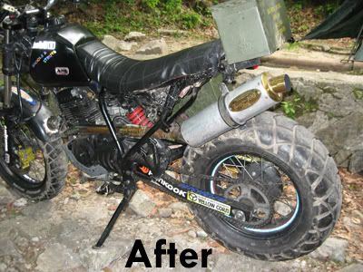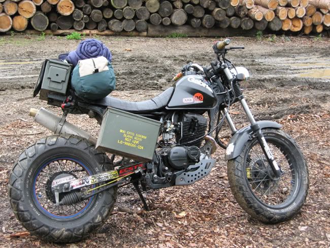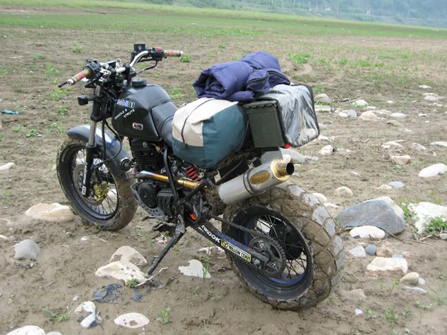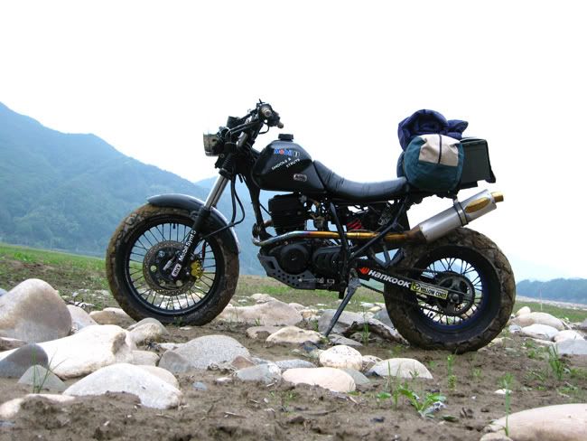 Brief Description: 2002 Hyosung Troy "Retro-Bobber inspired moto" with offroad capabilities. Comes with expensive custom pipes for this class (these custom pipes alone are worth 600 bones new), 24000km on odometer. Included are vintage US military ammo cases (air tight metal cases). Located in Seoul. Asking 1.0 Million Won (May 22, 2007). Your's in June. Plenty of time to inspect the bike and meet me. The Troy's engine is placed higher up in the frame for more multi-terrian environments...it goes where you want. The tires are sweet (180 rear); people often think this is a 600cc bike.