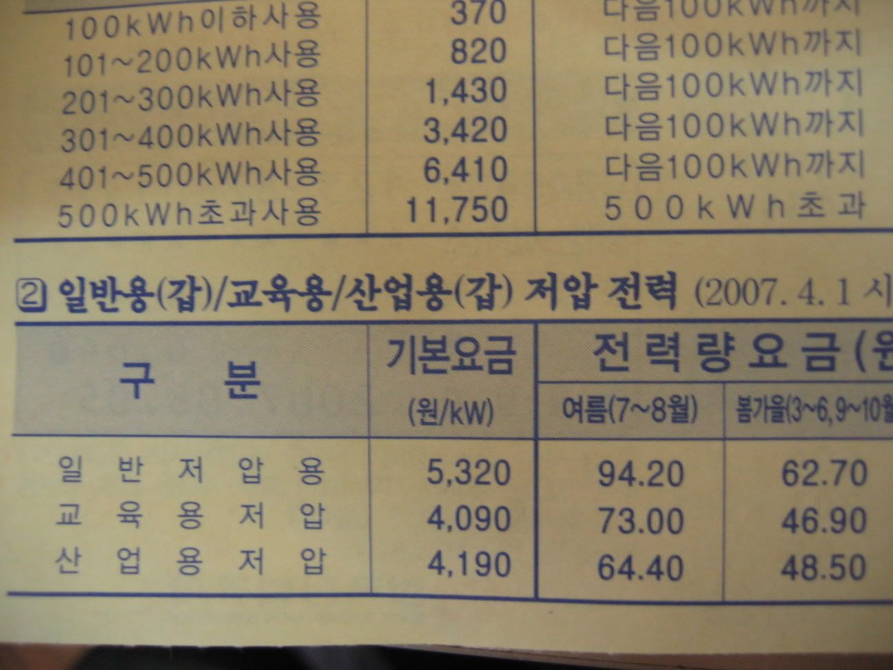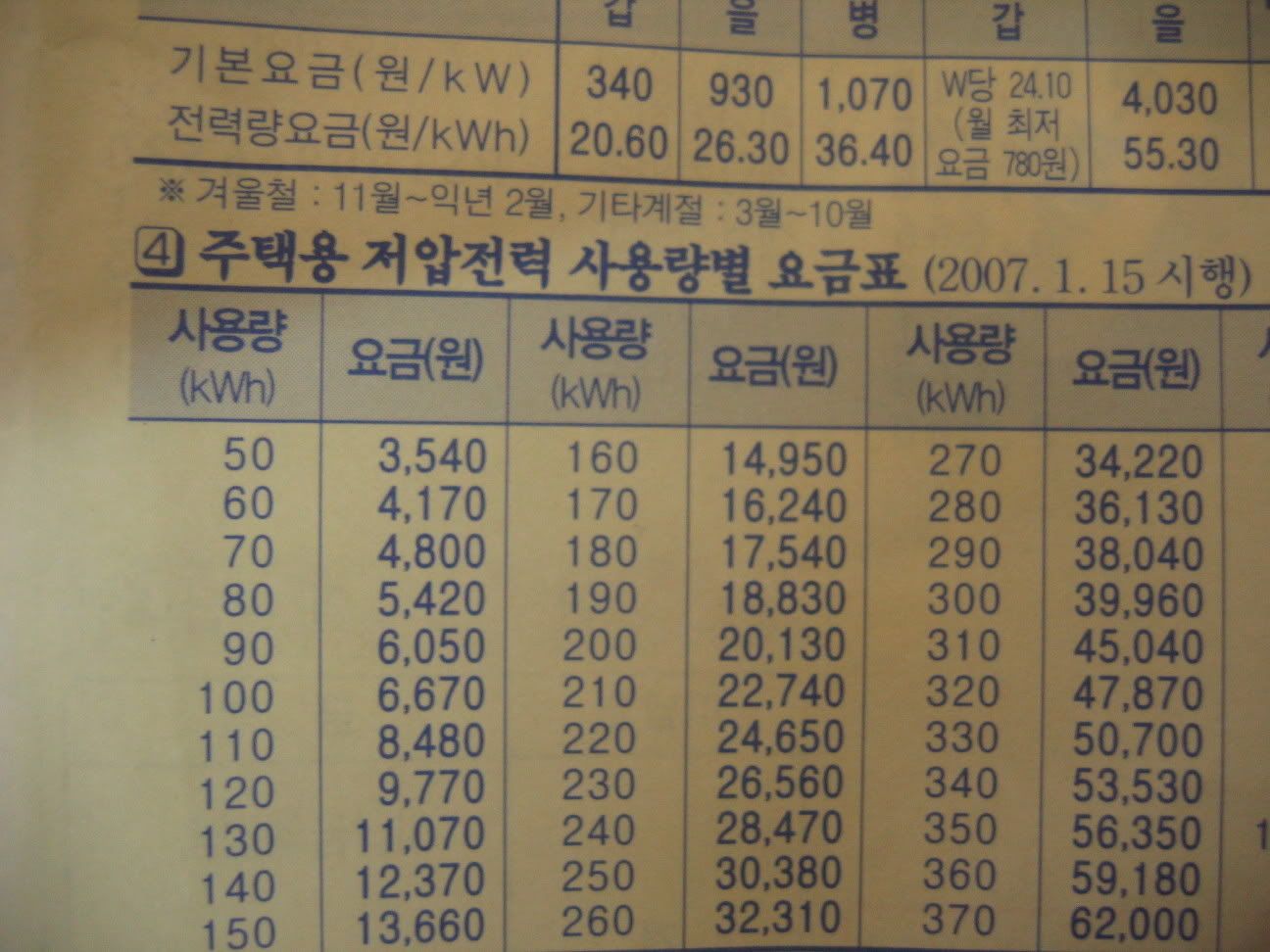 The pic shows that 370 kwh is 62,000 won. The rest of the chart (not posted) shows that 1,000 kwh is 487,680 won!!!  |