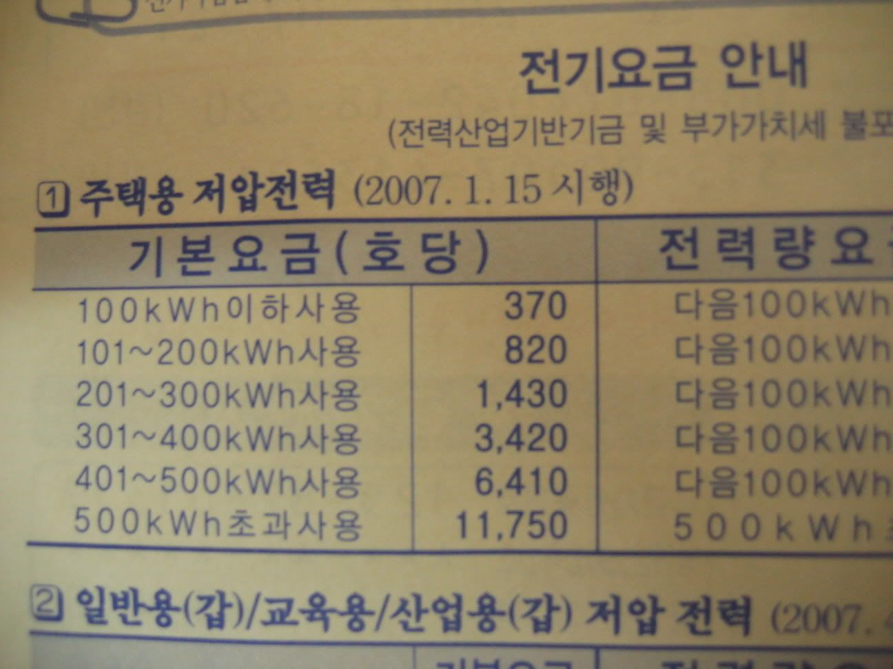 It's the law in Korea that the more electricity you use the more that you are charged per kilowat. I was shocked to see last month's bill. It was like 240,000w. |